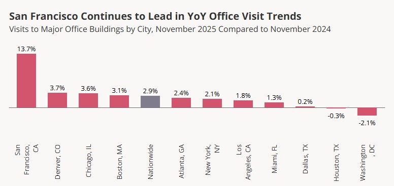Recent data shows San Francisco leading major U.S. cities in year-over-year office visit growth.